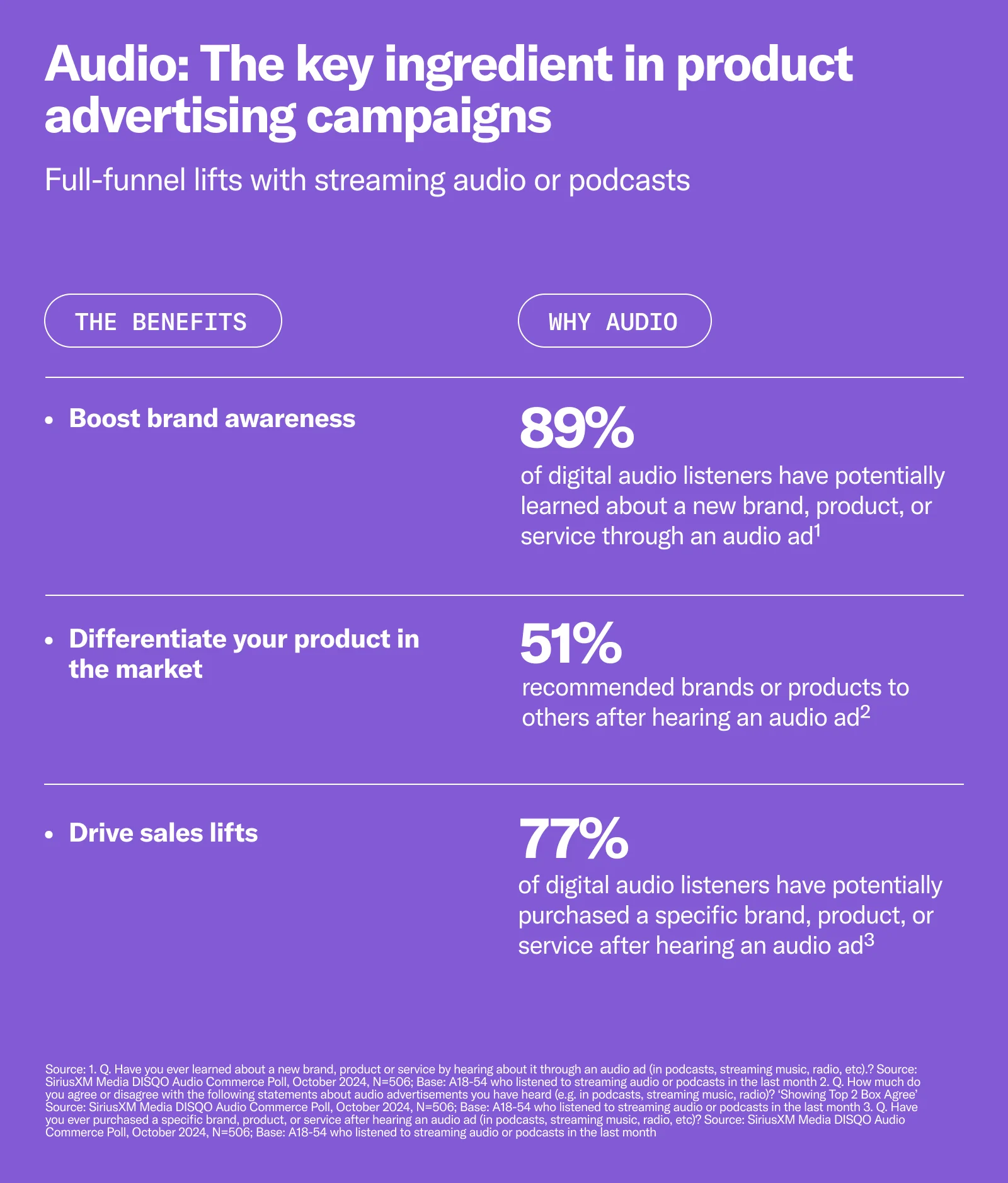 Whether you’re targeting upper-funnel or lower-funnel results, audio delivers both (and more) for your product advertising campaign.