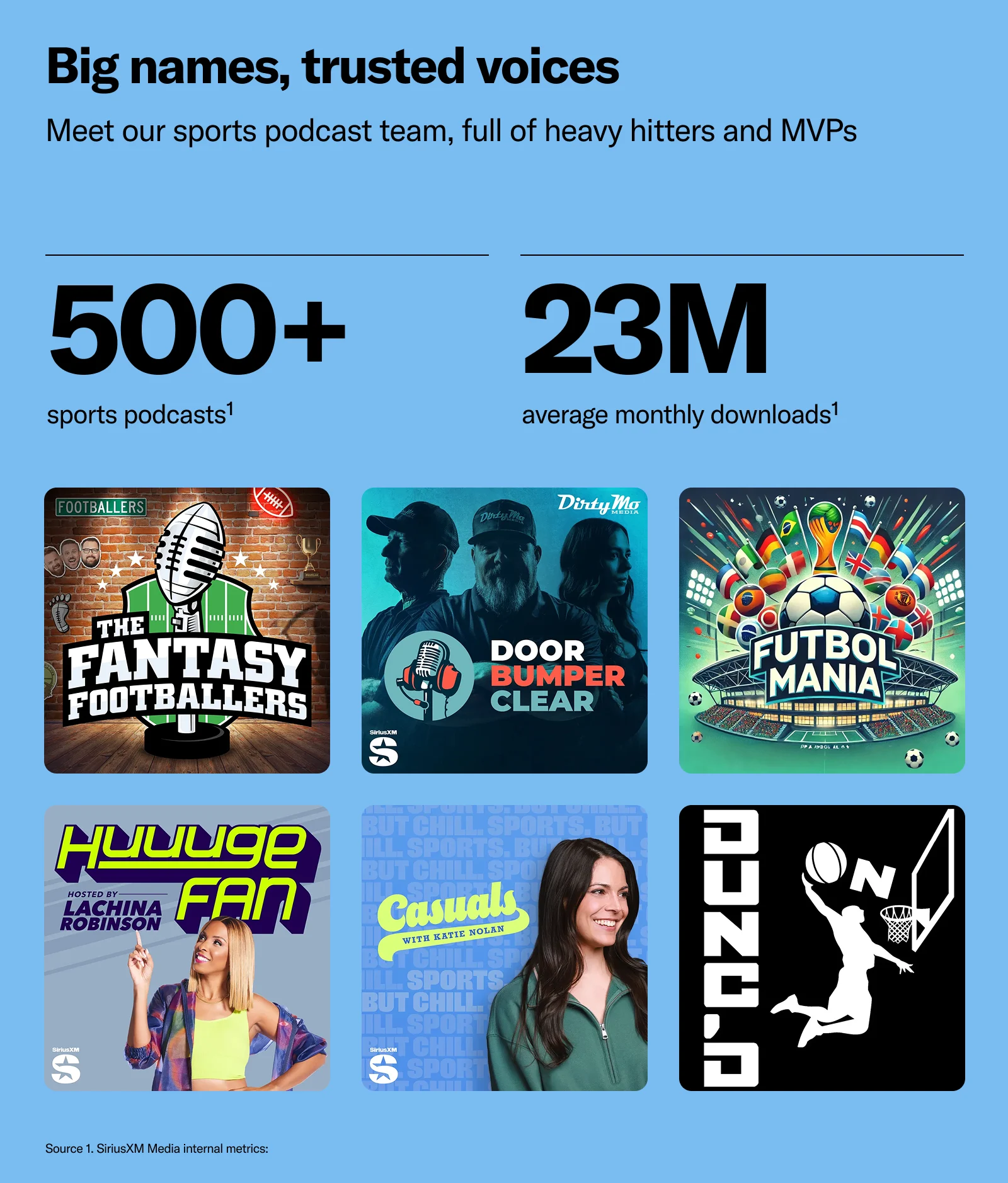 Sports podcasts are especially enticing for fans who are looking for in-depth analyses and perspectives. In fact, 63% of sports fans who are sports podcast listeners think sports shows dive deeper into topics than TV or social media and feature unique perspectives/opinions not covered in other media. The SiriusXM Podcast Network offers the can’t-miss coverage, whether it’s Casuals with Katie Nolan dissecting Winter Olympics drama and interviewing WWE’s the Bella Twins or CNBC Sport sitting down with Hall of Fame inductees and NFL executives to talk sports and business.