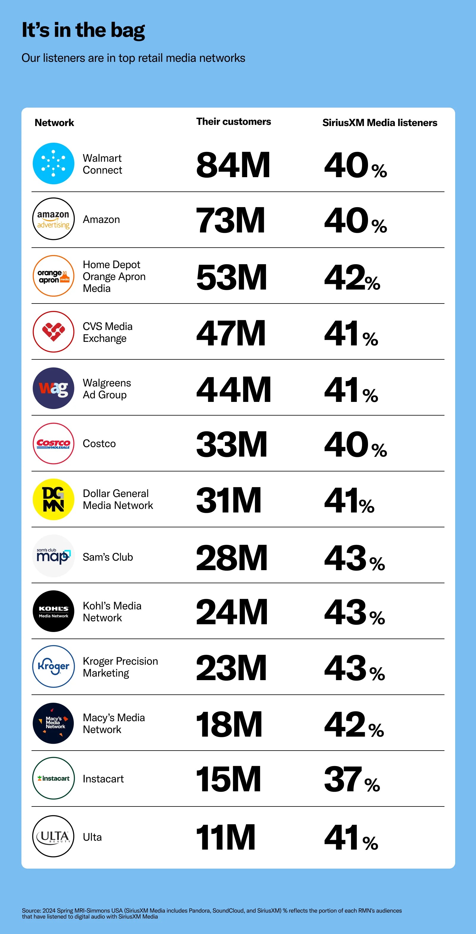 With the SiriusXM Streaming Network, it’s in the bag. Millions of our listeners are also customers on the top retail media networks.