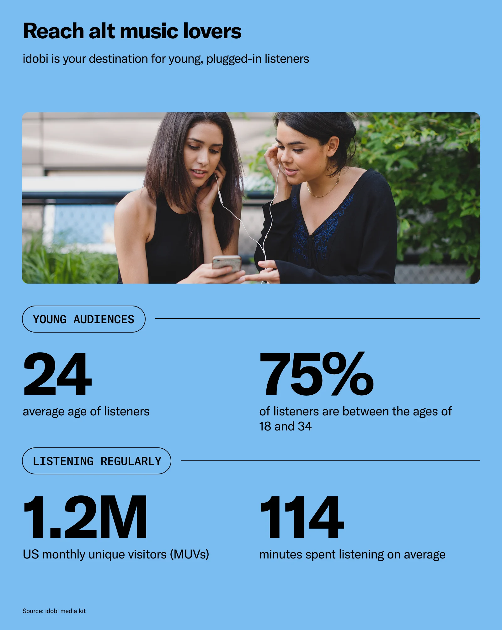 This shift away from the mainstream presents a golden opportunity for brands. Rather than casting wide nets with generic messaging, successful advertisers can lean into specific communities and personalize their messaging approach. idobi's alternative music audience allows brands to craft targeted messages that resonate with a passionate, engaged demographic that values authenticity and genuine connection to the cultures they love.