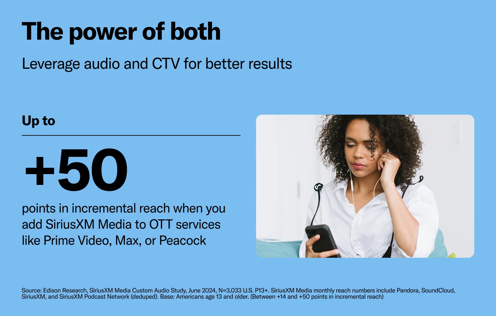 Here’s what’s at stake: When you add SiriusXM Media to OTT services like Prime Video, Max, or Peacock, you can get between +14 and +50 points in incremental reach. Among top CTV channels, 43% of SiriusXM Media listeners aren’t on YouTube, 58% aren’t on Hulu, and 77% aren’t on Peacock.