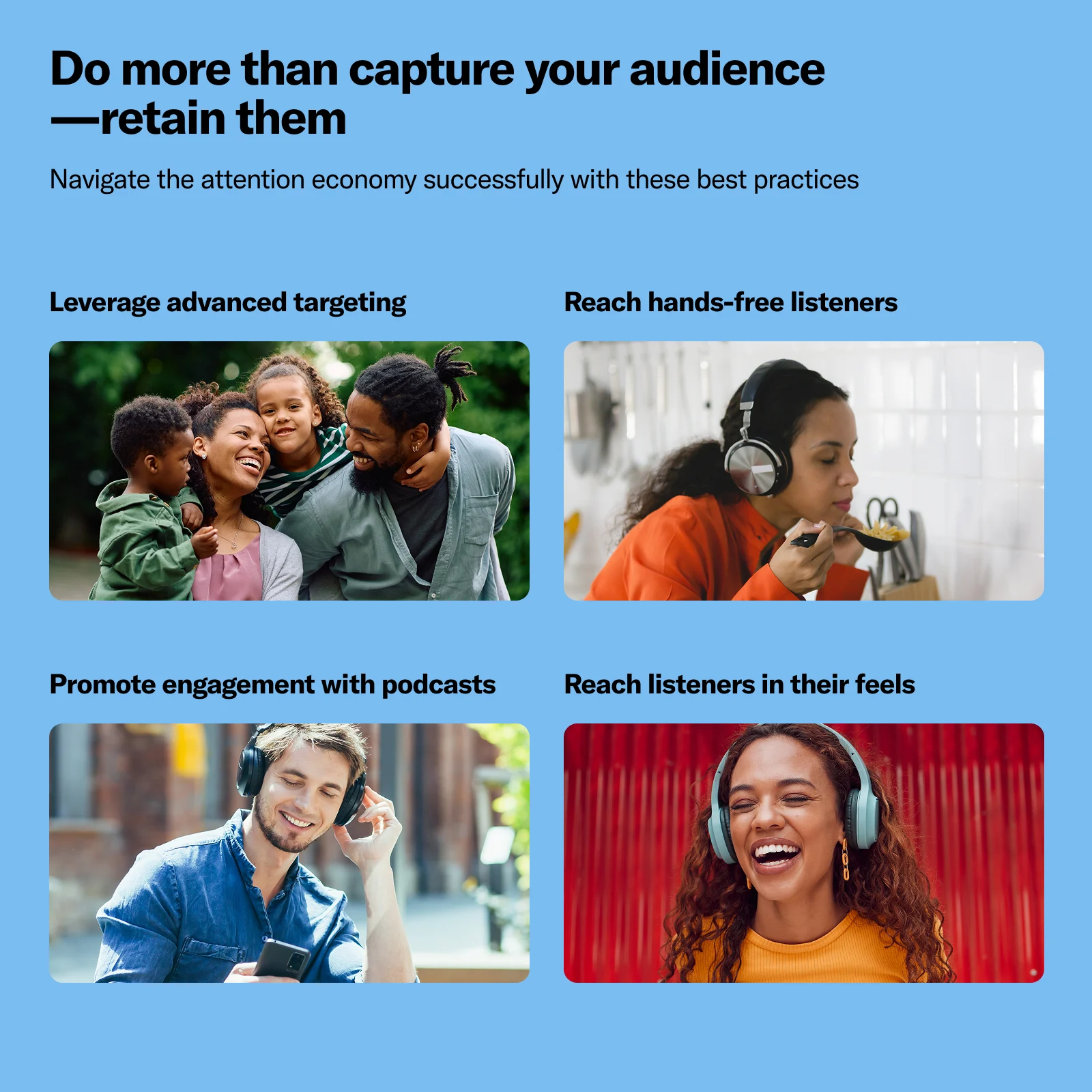 We understand the obstacles brands face in the attention economy age. Better yet, we offer the solutions, insights, and addressable audiences to help you turn them into opportunities. Together, we can take your next audio campaign to new heights and convert attention into lasting impact. Let’s chat.