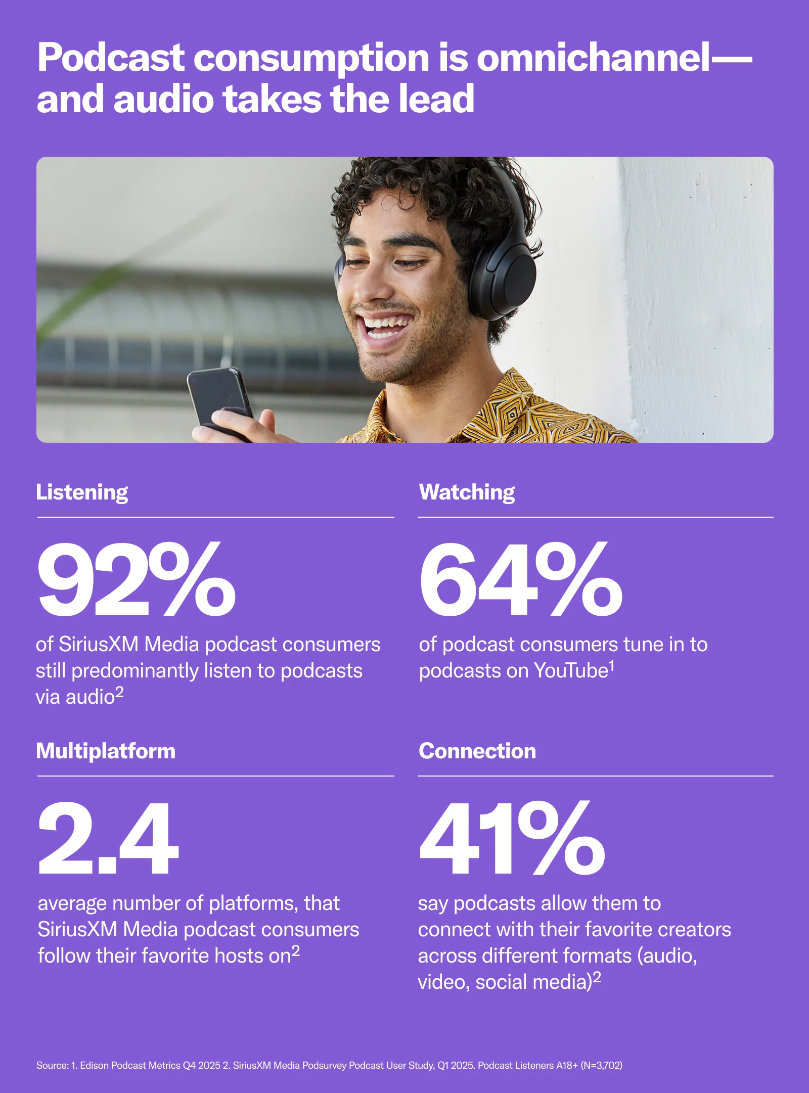 If you missed our 2025 Podcast Trends Report (don’t worry, it’s right here), podcasts are up for debate. With shifts in how they’re consumed, podcasts are growing to new heights. Video podcasts are stepping into the spotlight, and 64% of audiences are consuming podcasts on YouTube. 5 But we’re not bidding audio adieu, 92% of SiriusXM podcast consumers still predominantly listen to podcasts via audio. 6