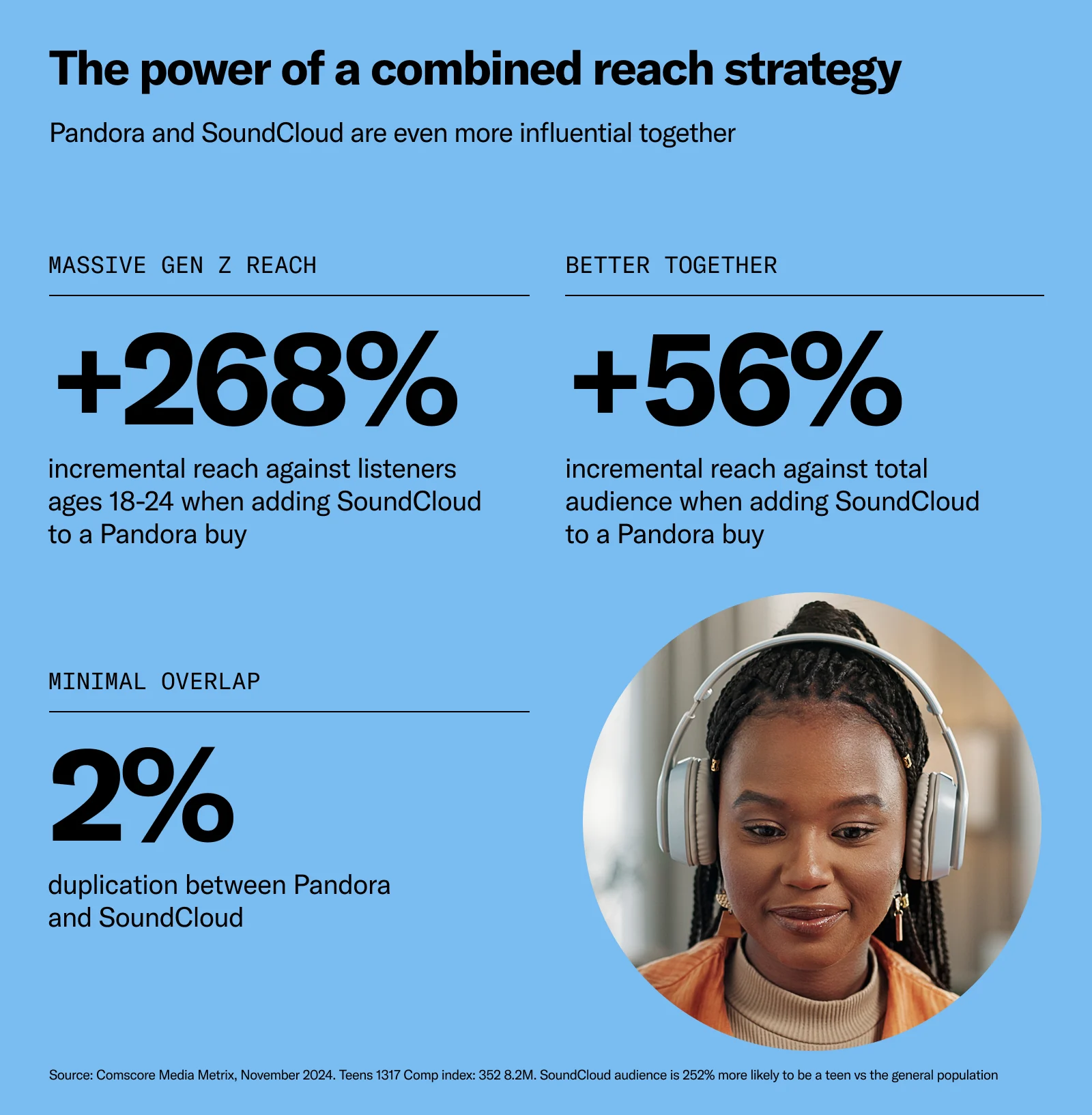 Here’s where we get to the good part: There’s only 2% duplication between Pandora and SoundCloud. By combining the influence and scale of both platforms, brands can leverage +268% incremental reach against listeners ages 18-24 when adding SoundCloud to a Pandora buy.