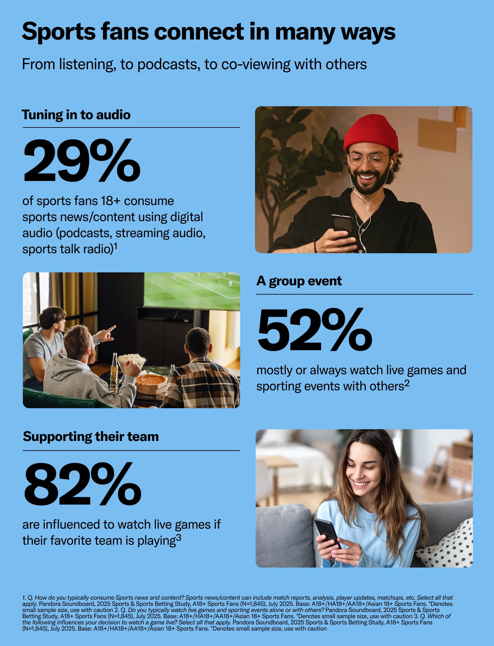 Sports is a universal language, bringing fans together of all backgrounds to join in on celebrating their favorite athletes, players, and teams. While two in three avid sports fans are men, women’s interest in sports is growing fast. Over 80M women consider themselves sports fans, and 67% consume sports audio to stay connected to their team and sport.