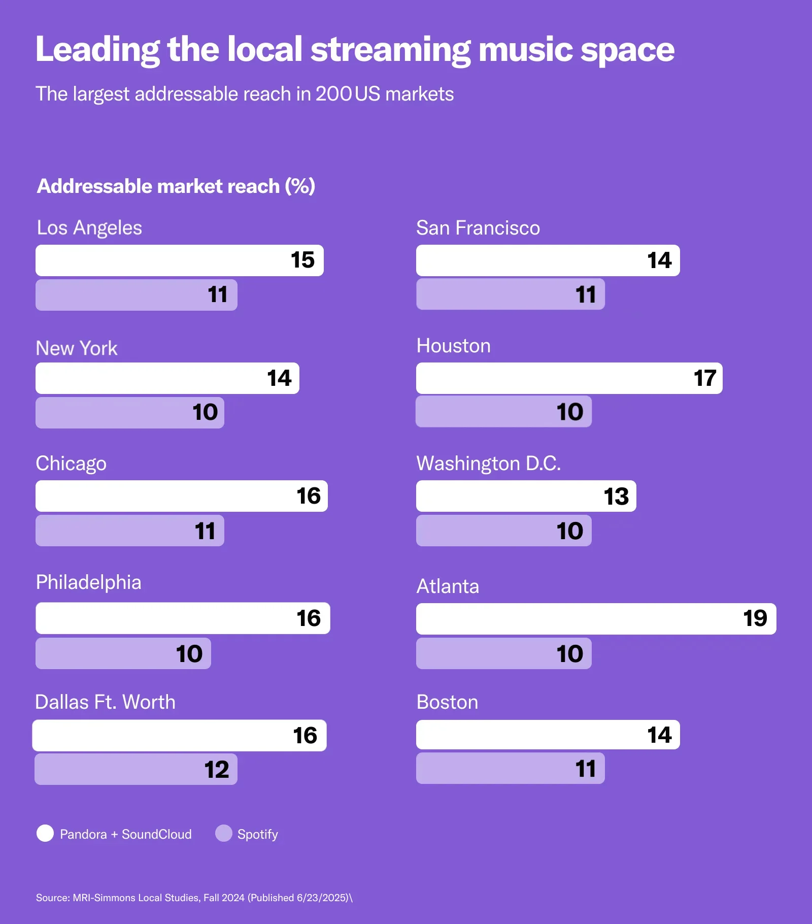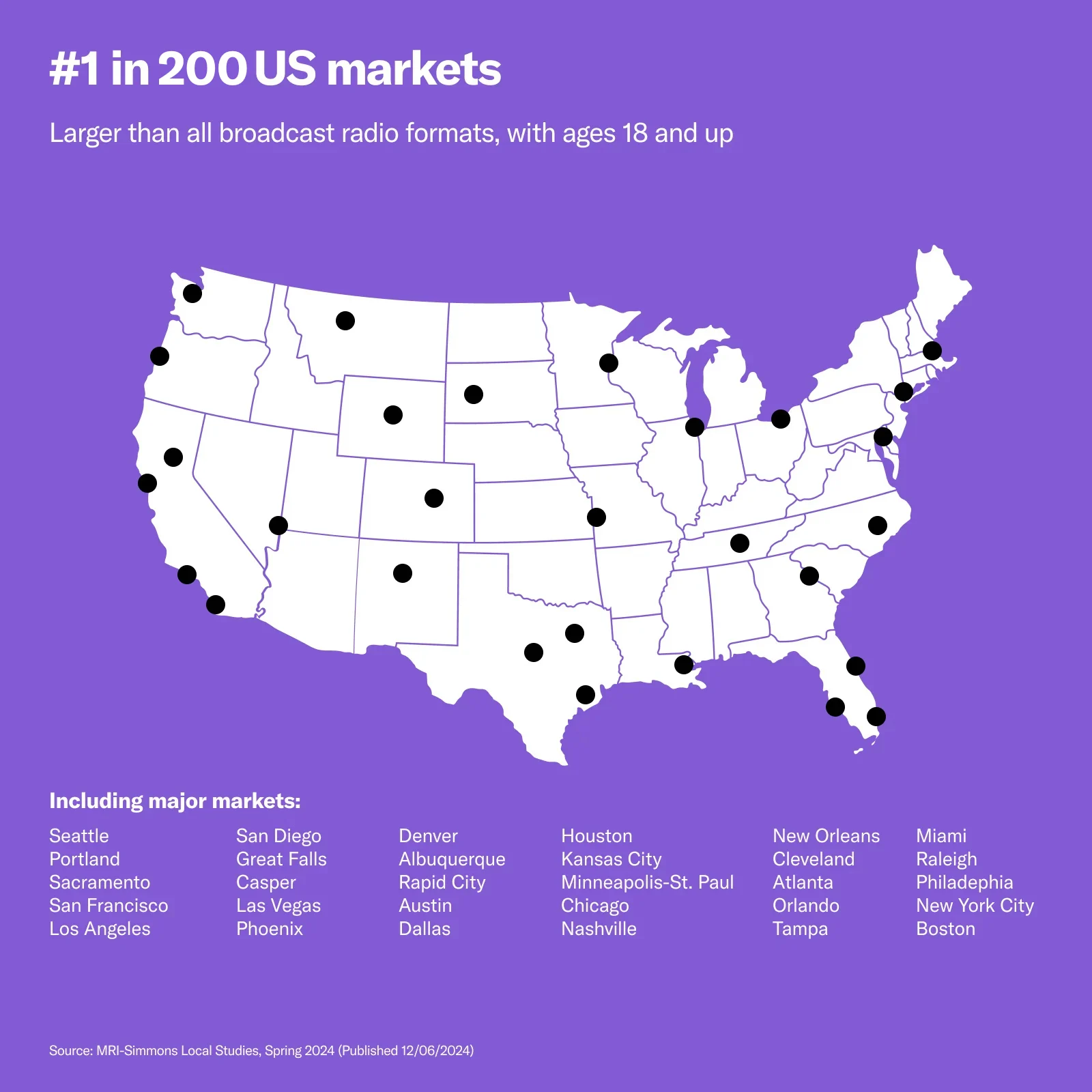 We aren’t just ruling the digital audio space when it comes to audience reach—we’re beating AM/FM, too. We are #1 in 202 US markets, larger than all broadcast radio formats, with listeners ages 18 and up.