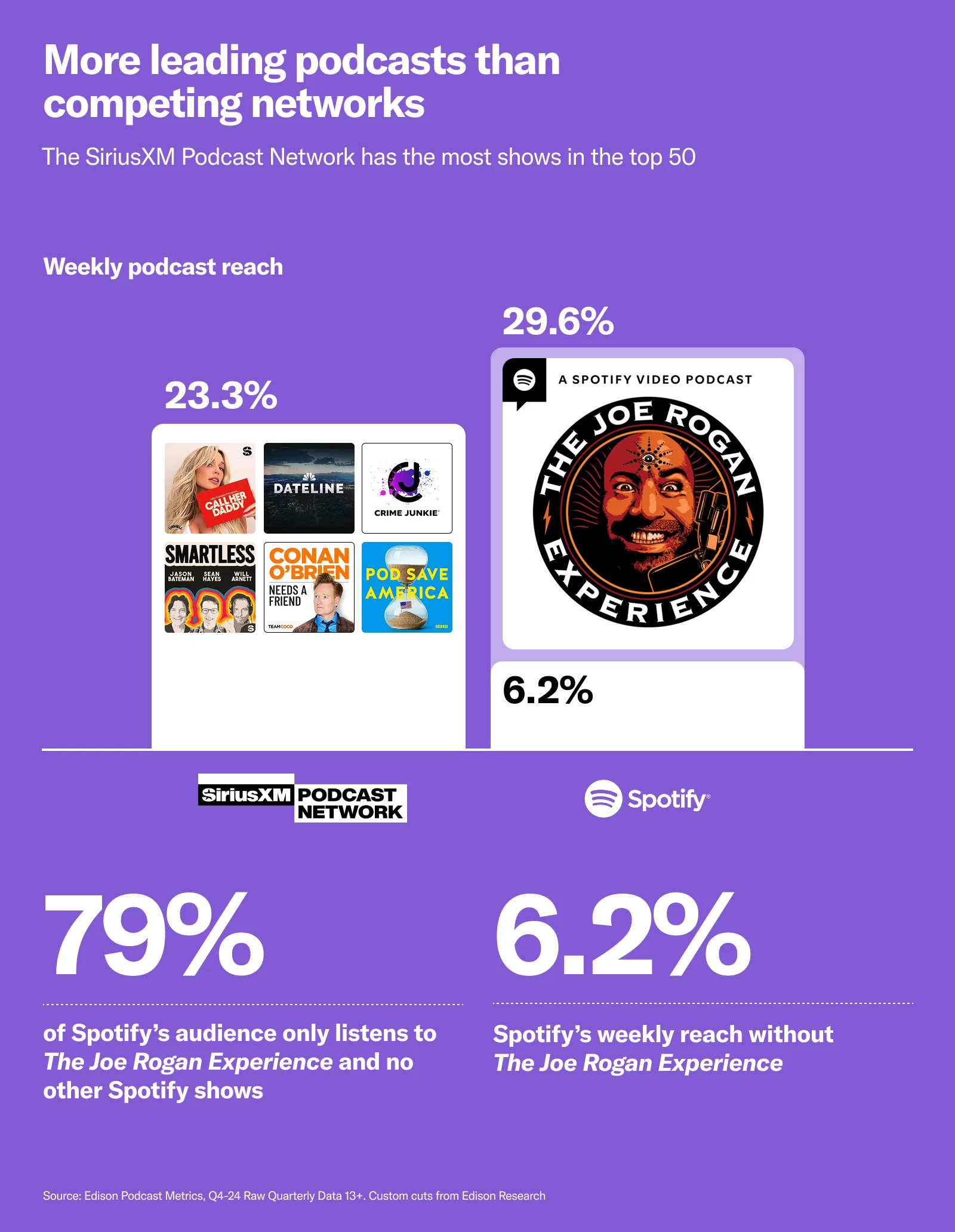 SiriusXM Media delivers scalable audiences via the SiriusXM Podcast Network. Our reach is spread across networks like audiochuck, Team Coco, Unwell, SmartLess Media, NBCUniversal, OWN, and dozens of additional safe and suitable spaces for your brand. Meanwhile, networks like Spotify Podcasts reach most of their audience shows like The Joe Rogan Experience. So, while Spotify reaches 27% of people ages 13 and up, without Joe Rogan, that reach drops to 5.9%.