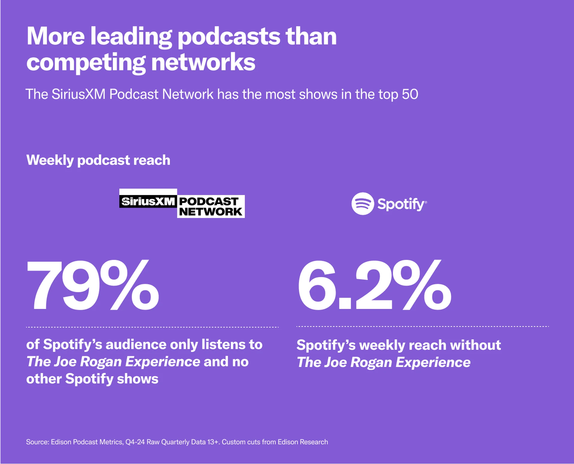 SiriusXM Media delivers scalable audiences via the SiriusXM Podcast Network. Our reach is spread across networks like Team Coco, Unwell, SmartLess Media, NBCUniversal, OWN, and dozens of additional safe and suitable spaces for your brand. Meanwhile, networks like Spotify Podcasts reach most of their audience shows like The Joe Rogan Experience. So, while Spotify reaches 27% of people ages 13 and up, without Joe Rogan, that reach drops to 5.9%.
