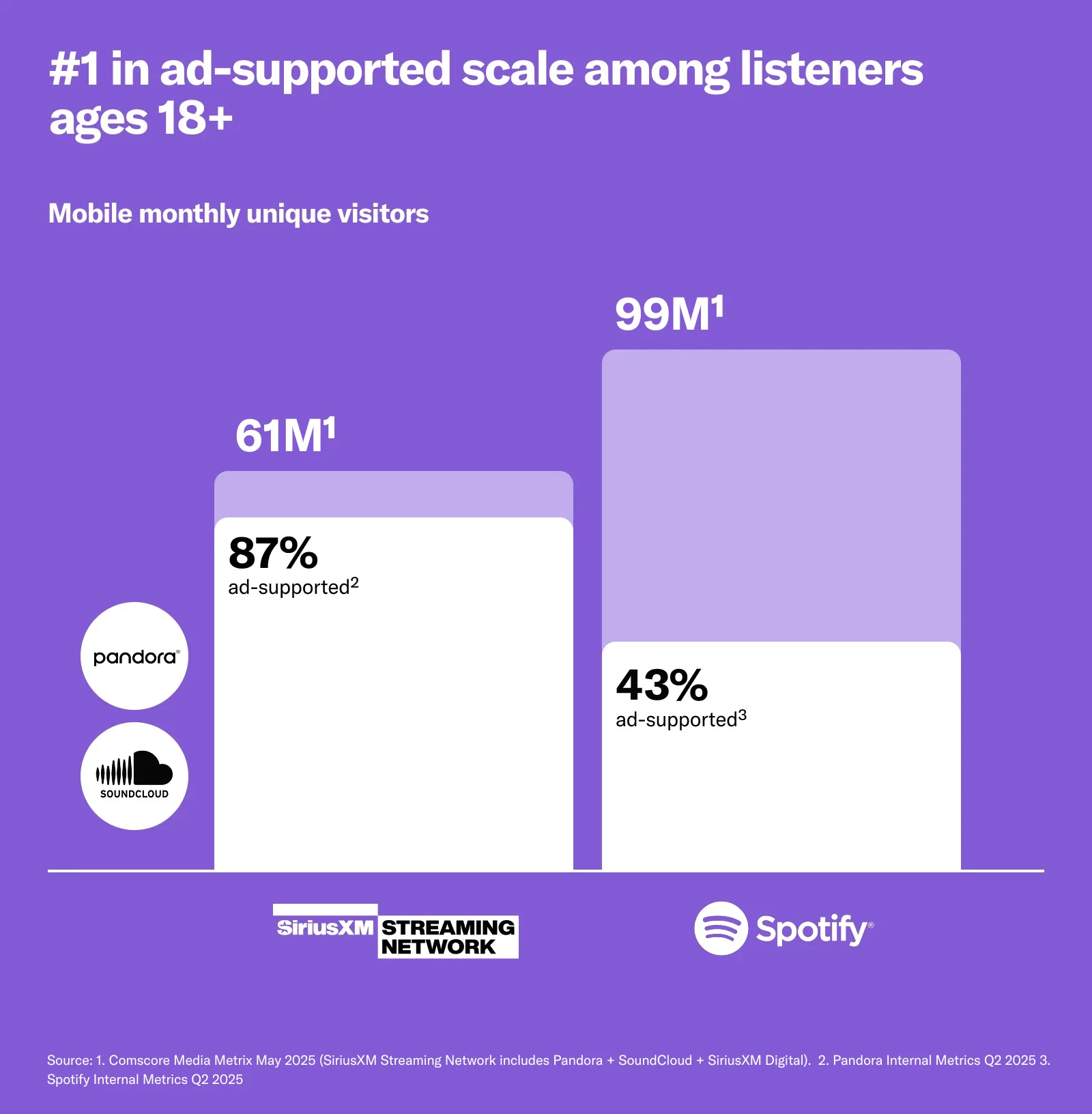 A truer indicator of scale is mobile unique visitors on Comscore—and that’s how we calculate our users. With the SiriusXM Streaming Network, you can reach 87% of our 61M mobile listeners across Pandora, SoundCloud, and SiriusXM digital, not including our partnerships with Audiomack, idobi, Spanish Broadcast System (SBS), and Sonos. You can find our property on Comscore as "Pandora SiriusXM Media."