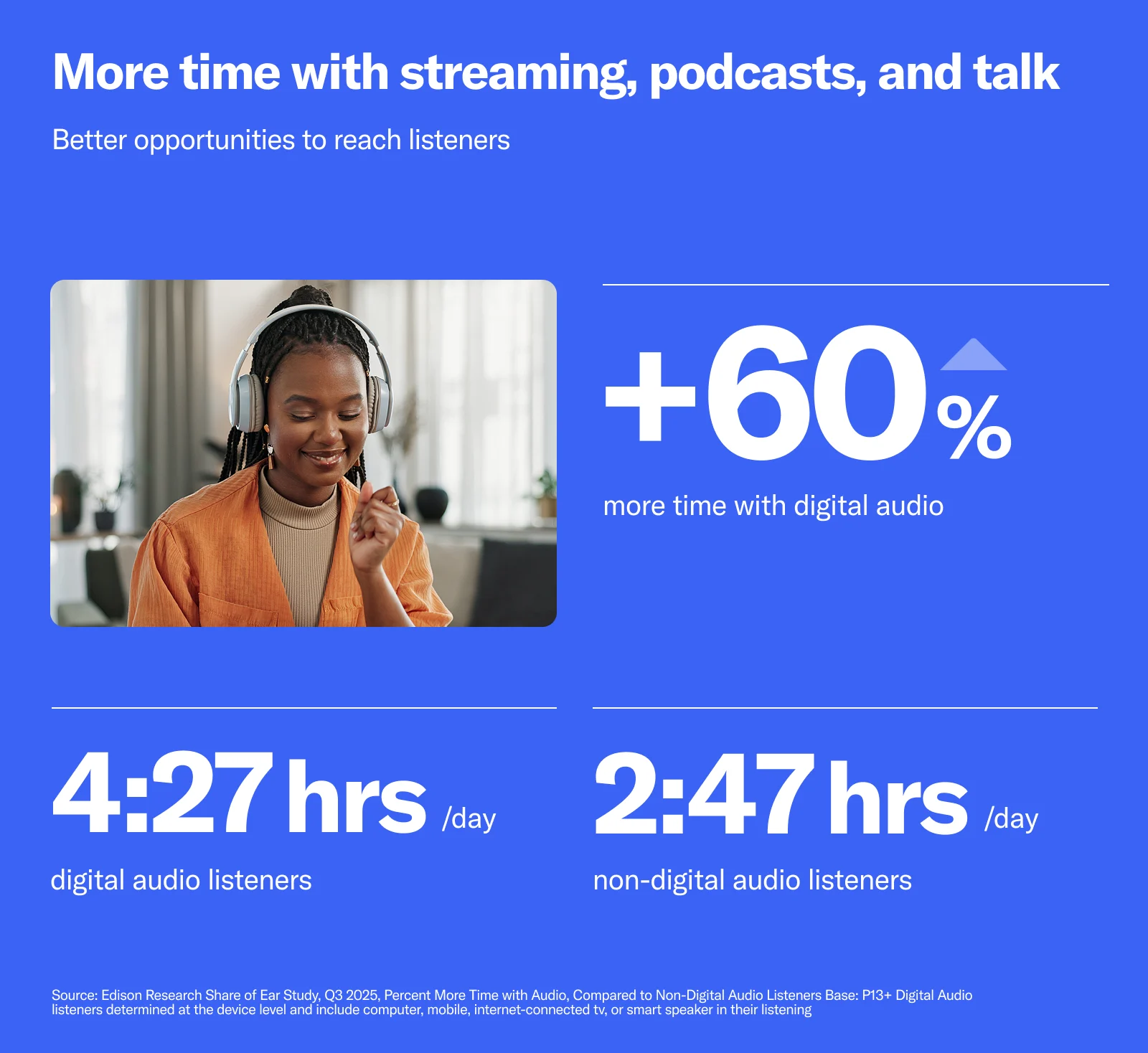 The latest Share of Ear report from Edison Research dropped. The findings are great for digital audio, and the news is even better for advertisers. In an ever-fragmented media landscape, digital audio delivers four hours and 27 minutes each day to reach audiences.