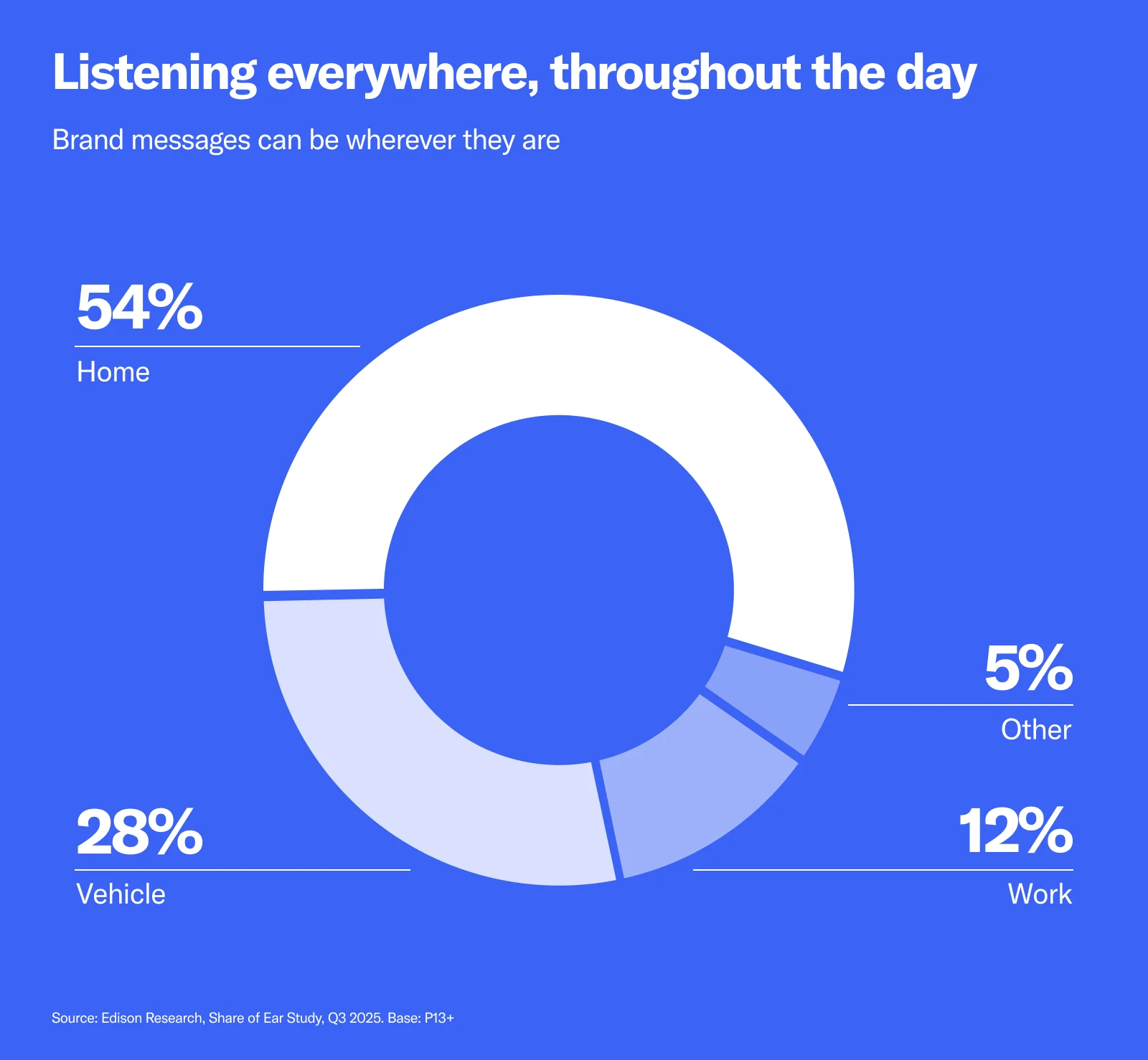 Audiences turn to digital audio throughout the day, no matter where they are. Over seven in 10 podcast listeners list the fact that podcasts are easy to access no matter what the day brings as a benefit. And 85% of streaming audio listeners say they want the audio content they enjoy to be available wherever, whenever. Well, that place is home 56% of the time.