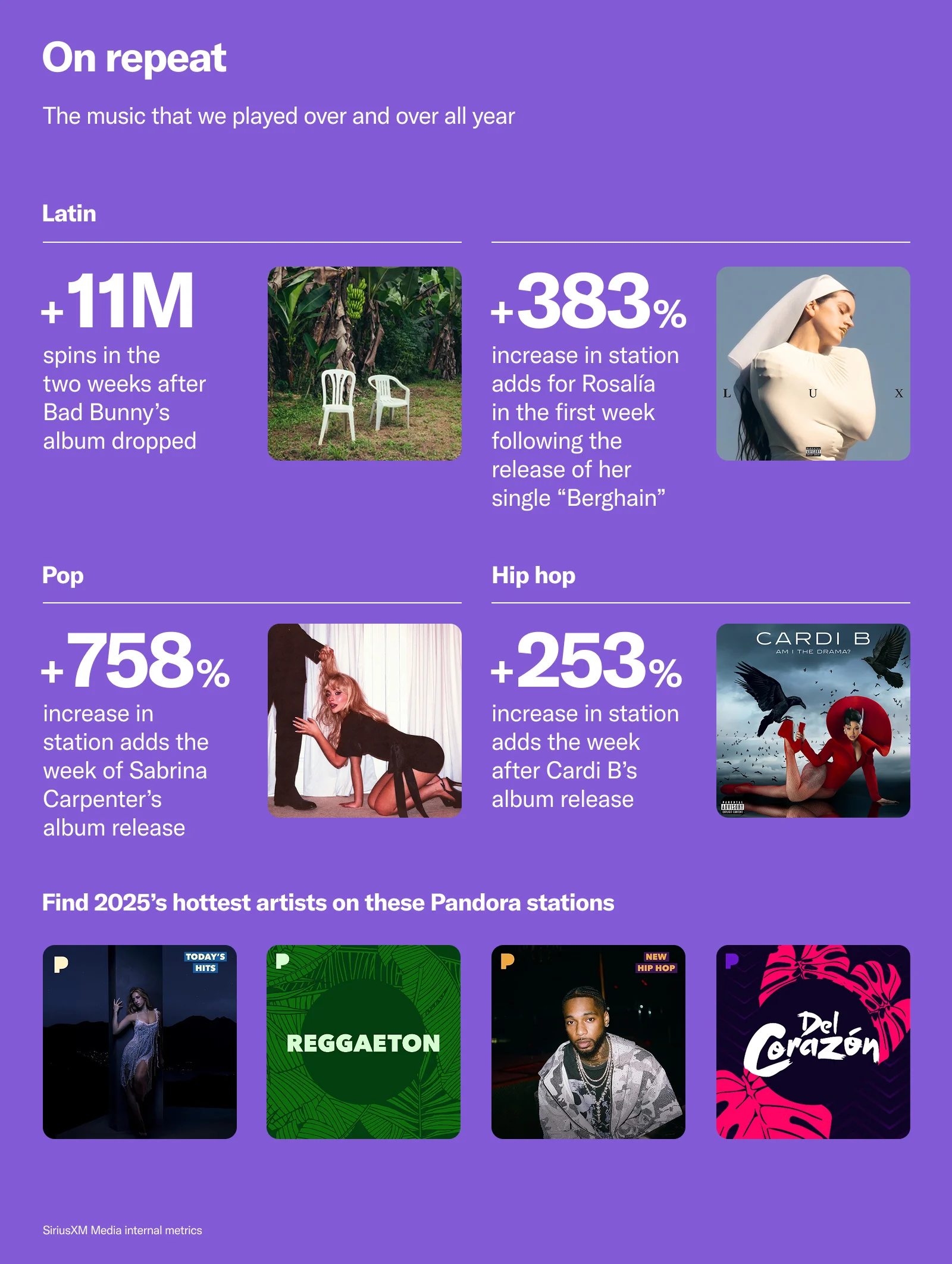 Ride the wave with Pandora, where you can sponsor fan-favorite stations. Find Sabrina Carpenter listeners on Today’s Hits, Bad Bunny fans on stations like Reggaeton, and Cardi B and Metro Boomin lovers on stations like New Hip Hop.