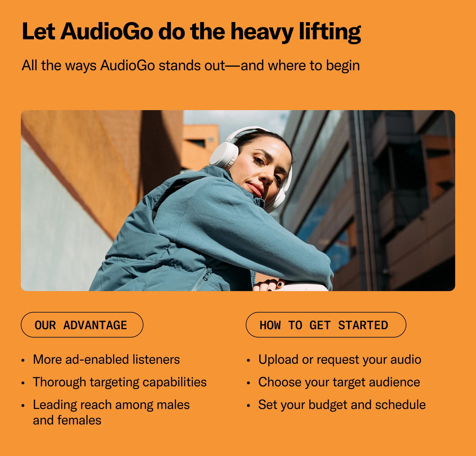 AudioGo is perfect for small-to-medium businesses, creative agencies, startups, and franchises who may not have the budget or resources for a larger or more complex campaign—and brands with larger budgets can benefit, too. Whether you're an independent florist, manager of a small, family-owned bistro, or a regional retailer, AudioGo makes audio advertising cost-effective and incredibly easy to implement. Investing in brand awareness campaigns? AudioGo has you covered. Conducting geographic targeting? We have that, too. Need assistance with real-time performance reporting? It’s all here.