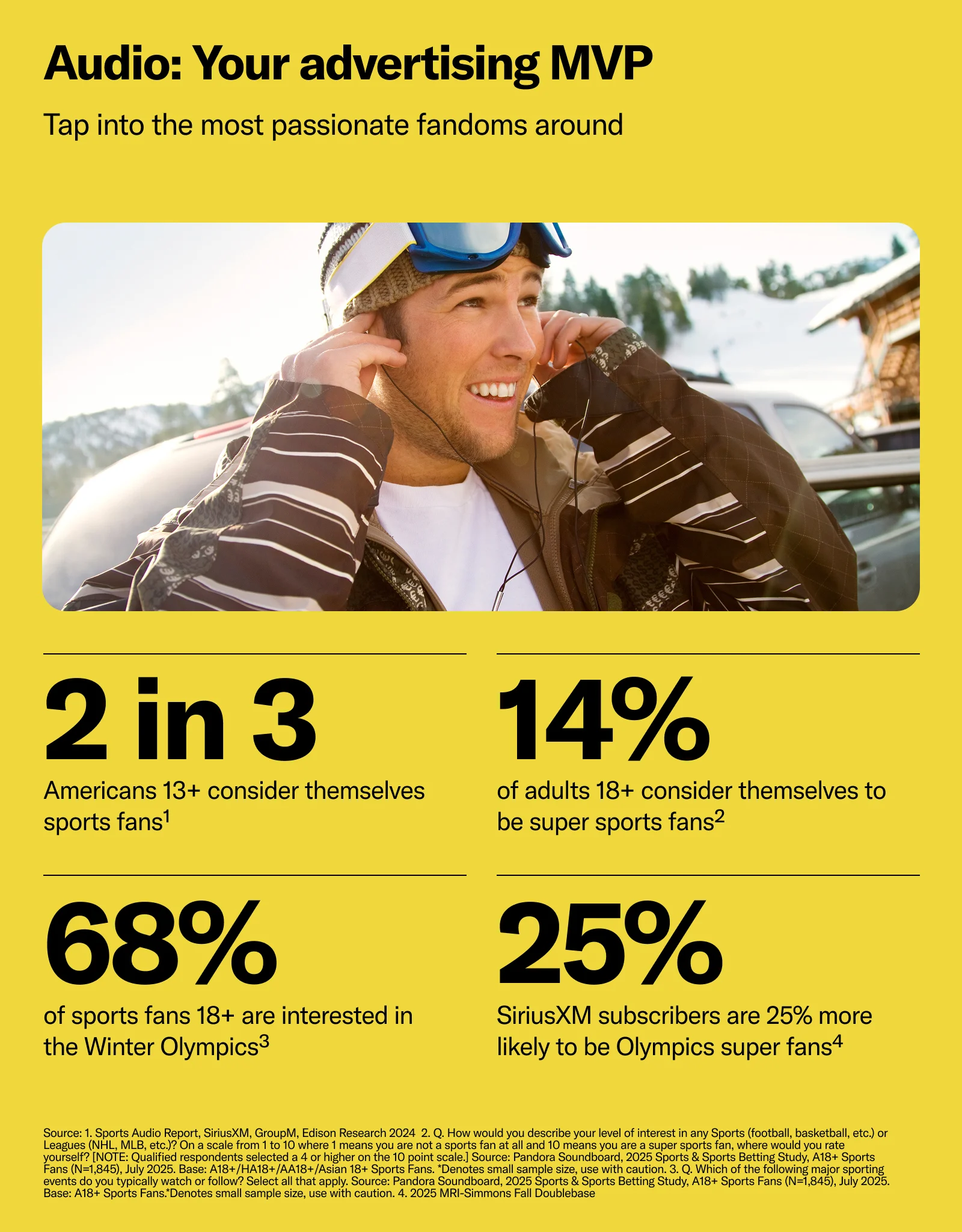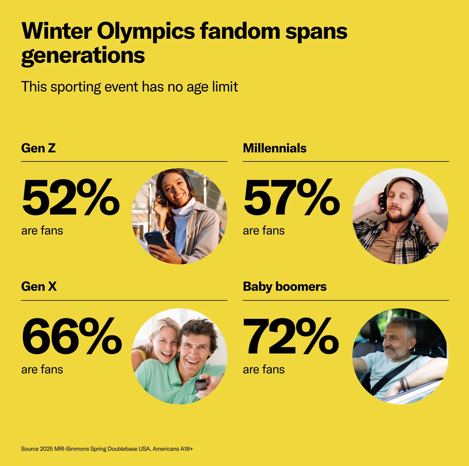 Two in three Americans 13+ consider themselves sports fans, which means plenty of multi-generational reach for brands. And when it comes to the Winter Olympics, its fandom is almost evenly spread out across all generations, whether they enjoy differentiated content or a sense of community. Over half of millennials (57%) are Winter Olympics enthusiasts , and 72% of baby boomers are fans. Additionally, SiriusXM subscribers are 25% more likely to be Olympics super fans.